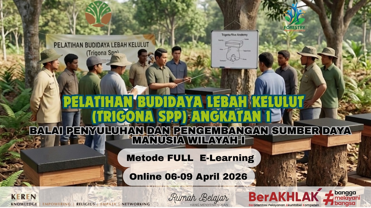 Areal hutan yang cukup luas serta kaya berbagai macam jenis tumbuhan berbunga, dapat dijadikan sebagai sumber pakan dalam budidaya lebah madu. Memperhatikan kondisi di lapangan bahwa budidaya lebah madu yang dilakukan oleh masyarakat masih belum mendapat penanganan secara optimal sehingga berdampak pada produktivitas dan kualitas madu yang masih rendah. Untuk mengatasi permasalahan di atas, maka masyarakat sebagai penentu keberhasilan dalam budidaya lebah madu kelulut (Trigona spp) ini diperlukan pengetahuan, keterampilan dan sikap yang memadai melalui Pelatihan Budidaya Lebah Madu Trigona spp. Diharapkan setelah mengikuti pelatihan ini dapat melakukan cara budidaya lebah madu kelulut (Trigona spp) dengan baik.